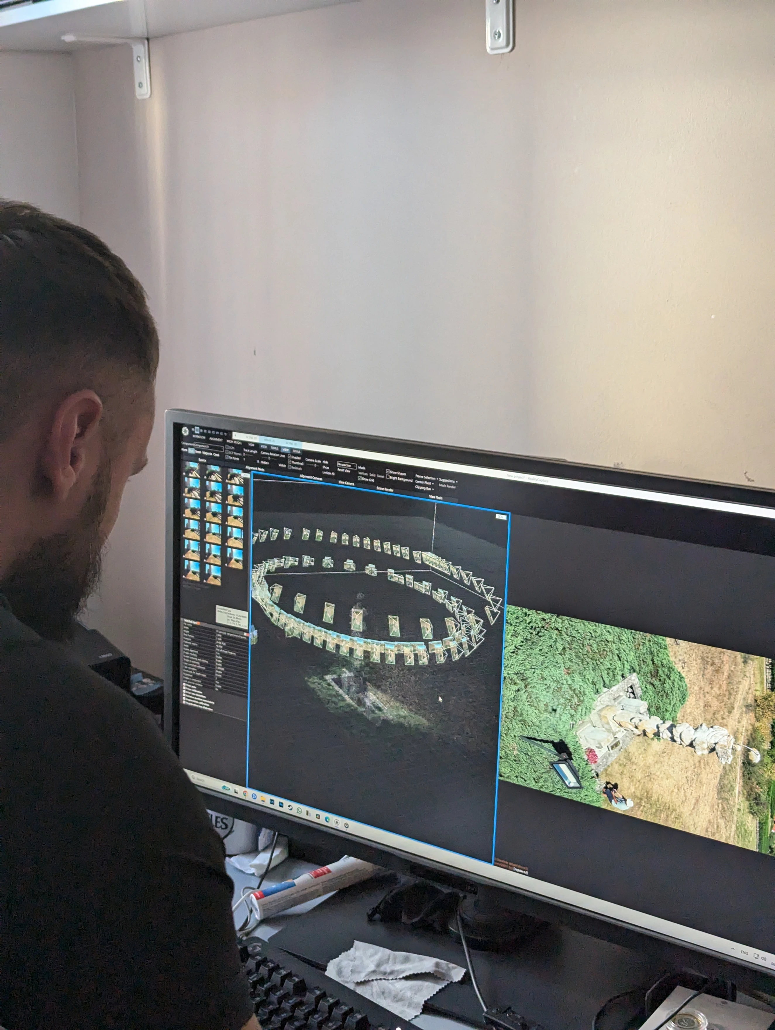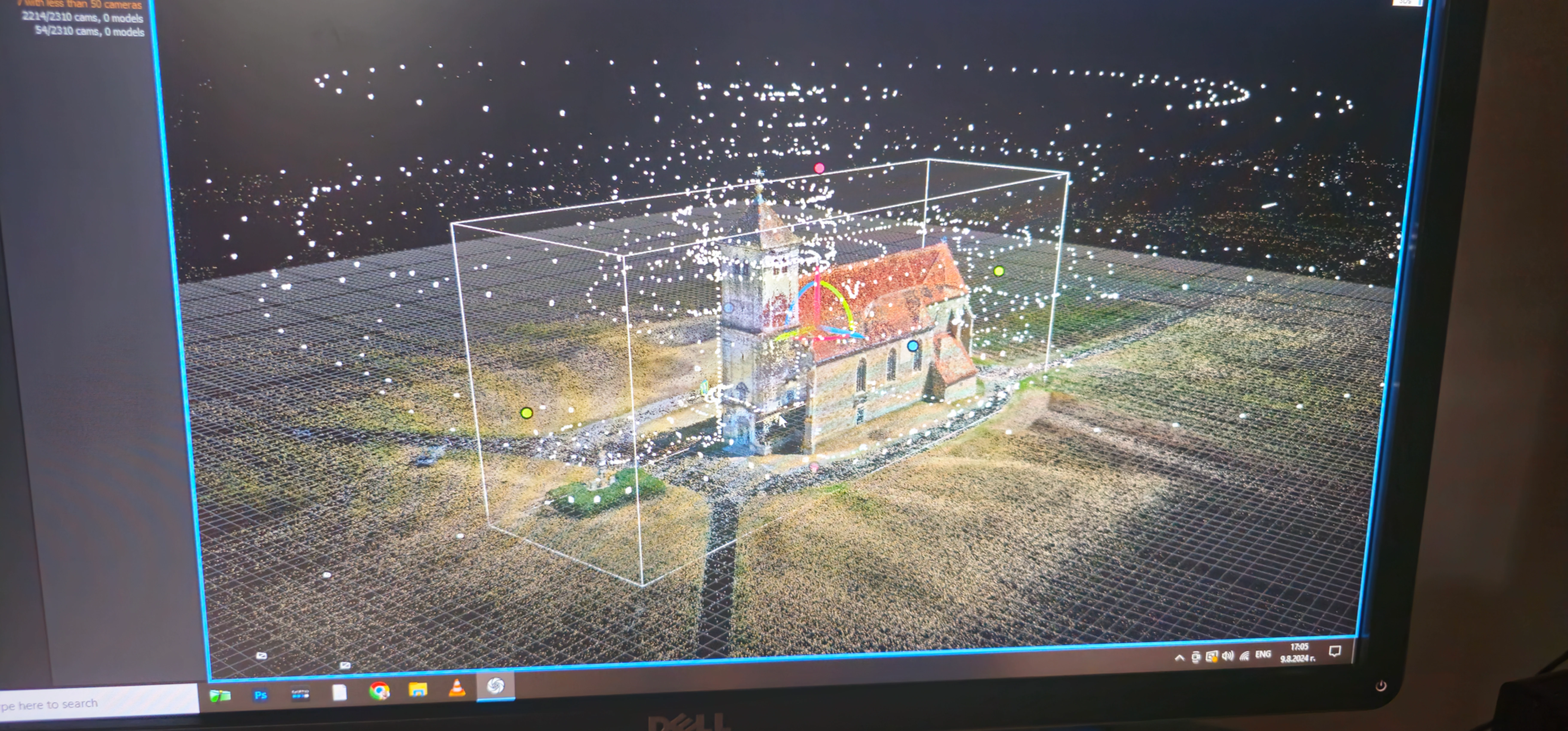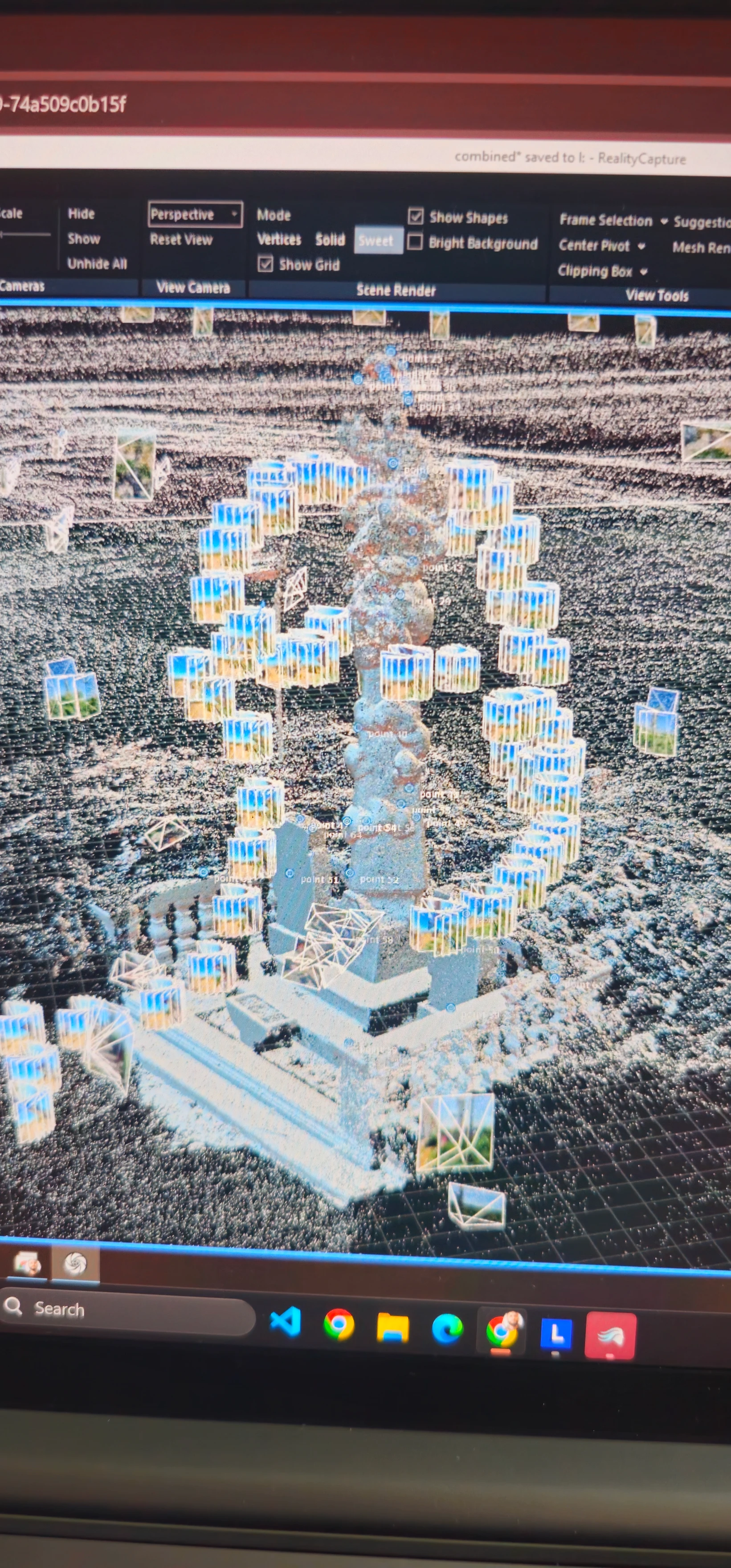 Every photograph—whether captured by drones, DSLRs, or extracted from Insta360 video footage—was imported into RealityCapture as an individual still image. The software performed automatic feature detection and used Structure-from-Motion (SfM) to solve for camera positions and orientations, aligning all images into a single coordinate system. When available, on-site ground-control points (GCPs) were used to georeference the model, ensuring centimeter-level accuracy. A dense point cloud was then generated, capturing the detailed geometry of the sites. The inclusion of frames extracted from video footage provided additional images from various angles, enhancing coverage and helping to reconstruct areas that were difficult to capture with still photography alone. From the point cloud, a triangular mesh was created, and textures were baked using the high-resolution still images, resulting in visually rich, photo-realistic models.